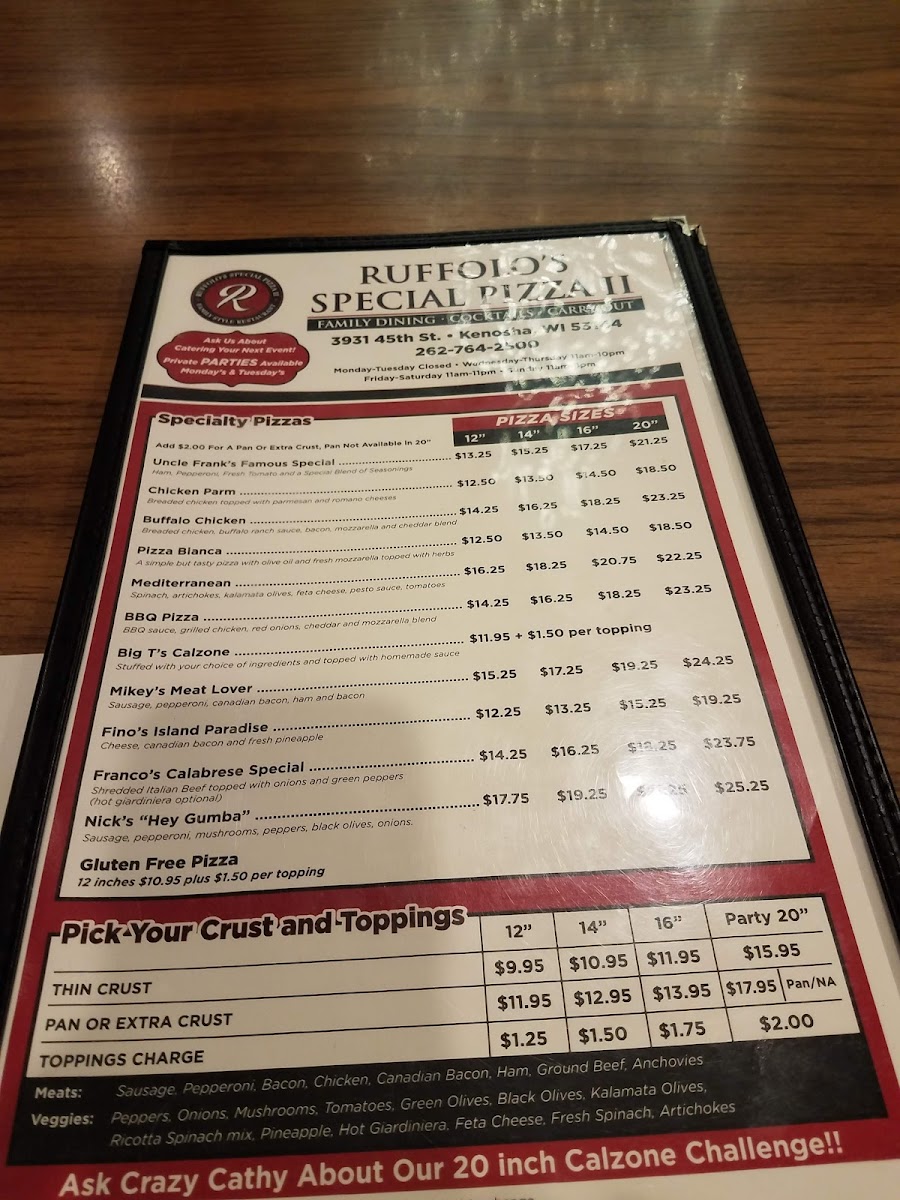 Introducing Ruffolo's Special Pizza 2, located at 3931 45th St, Kenosha, WI, this gem redefines Italian cuisine with an authentic touch. The menu features a delightful range of offerings, from starters like the Abbondanza Platter, highlighting calamari and homemade breadsticks, to hearty Italian dinners such as rich lasagna and comforting gnocchi. Each dish is crafted with care, showcasing their homemade sauces and fresh ingredients.
